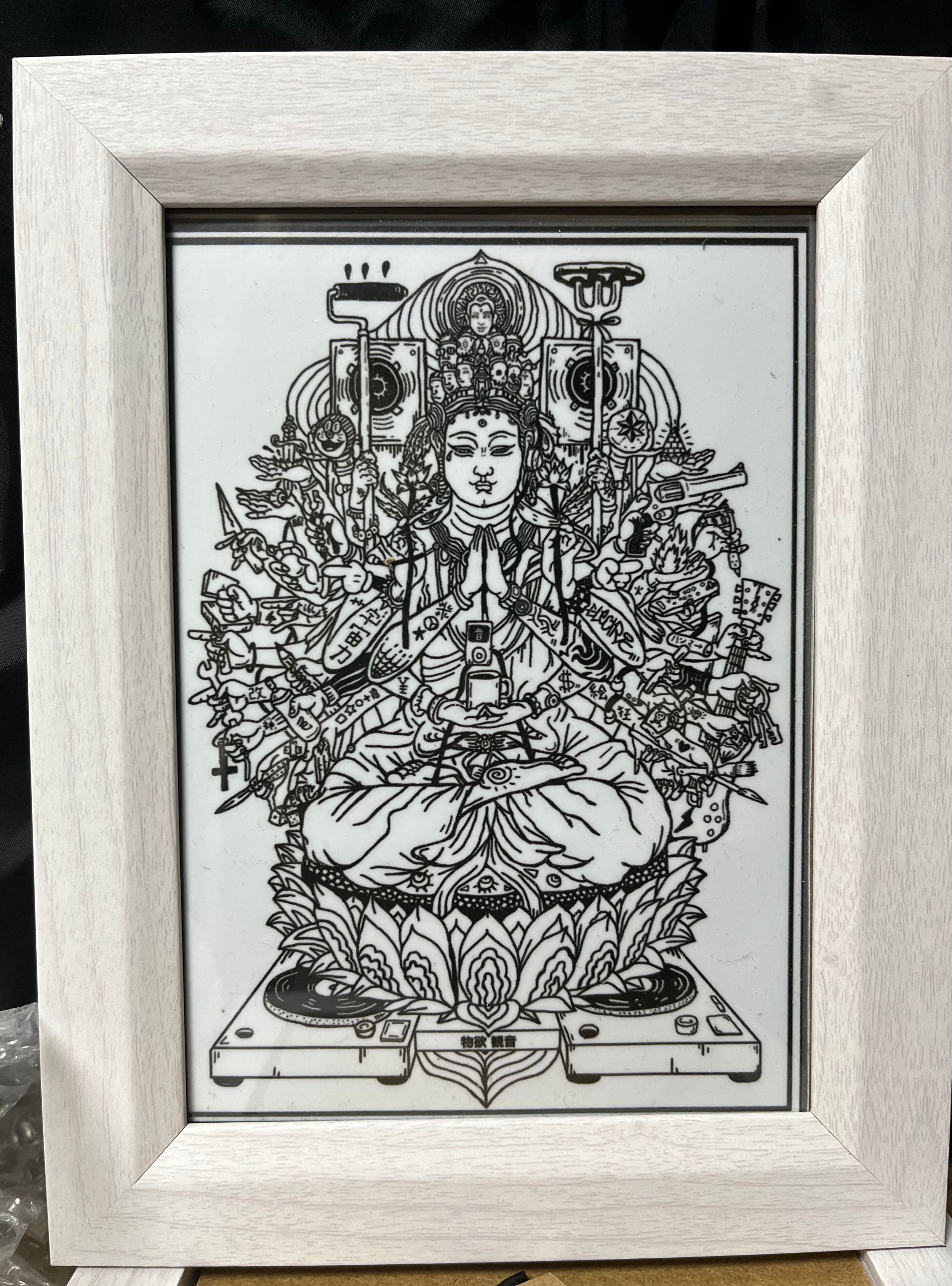 物欲強欲にまみれたハードコアな観音様イラストをポスター化したものになります。立て掛け、ピンやひっつき虫などで壁に貼る2wayな使い途があります。