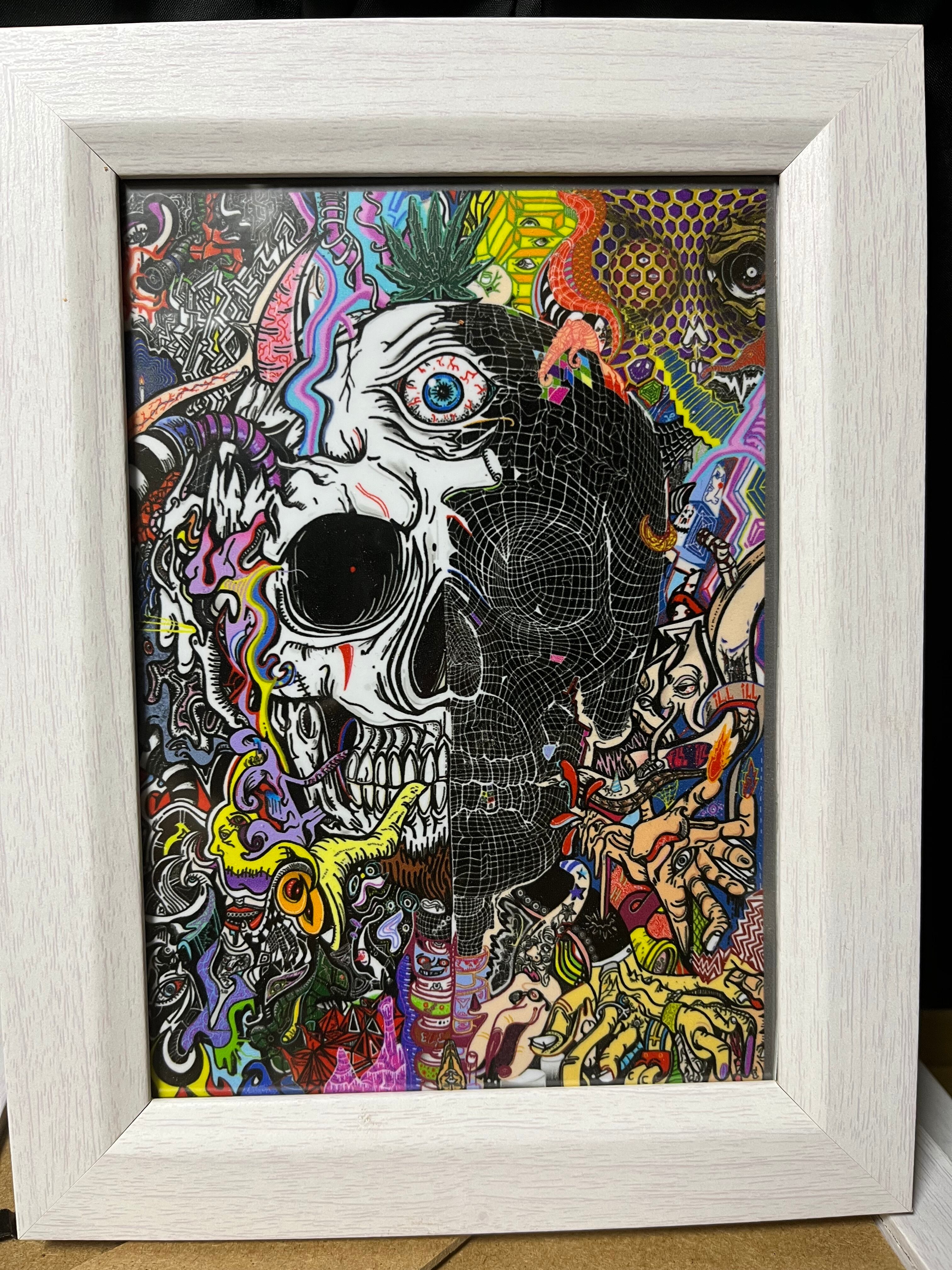 サイケデリックな骸骨を更にサイケにしたイラストをポスター化したものになります。立て掛け、ピンやひっつき虫などで壁に貼る2wayな使い途があります。